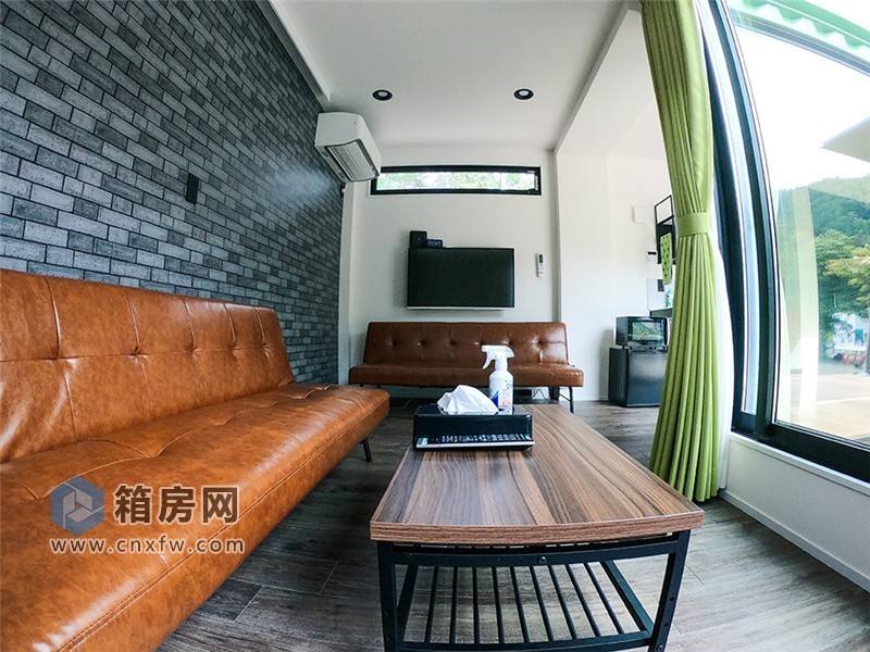 紅、綠、黃集裝箱分別被設計成不同主題的房間,配有沙發、桌子、電視,沙發靠背傾斜便可以變身成床,共可容納約 7 張榻榻米,這是一個可以同時享受室內和室外的空間。其中,綠色容器為榻榻米型,紅色容器有兩張單人床,黃色容器為雙人床。