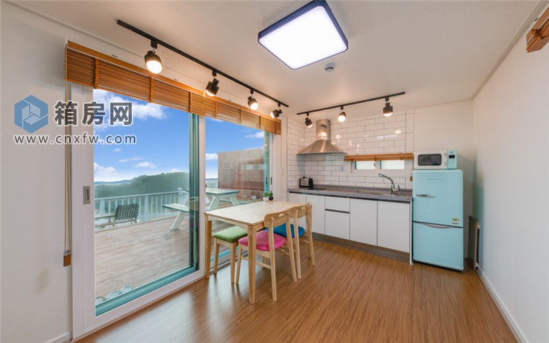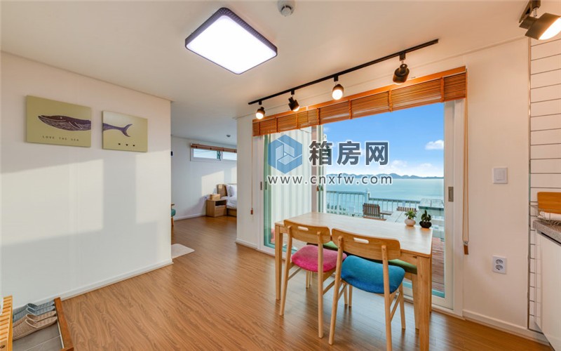 室內(nèi)采用開放式布局,廚房、餐廳和臥室都在同一空間內(nèi),沒有門的阻隔,兩個(gè)集裝箱從內(nèi)部打通,這使得空間看起來更寬敞。同時(shí),裝潢也以簡潔和明亮為主,因?yàn)閼敉獾木吧鸵呀?jīng)夠美了。