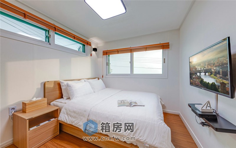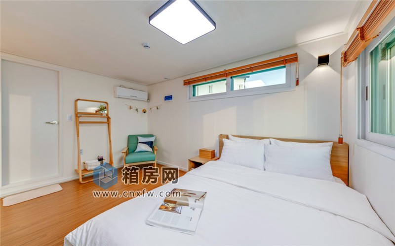 臥室的入口是休憩一角,一張北歐風(fēng)格的沙發(fā)放置在這里,提供了一個(gè)看書、放松的角落。旁邊是一張舒適的床,靠墻而設(shè),圍繞在床的上方是兩個(gè)用以通風(fēng)和透光的窗戶,一起床便能看到海。整體環(huán)境用木制家具和地板來修飾,以簡約為主,卻營造了溫馨的氛圍。