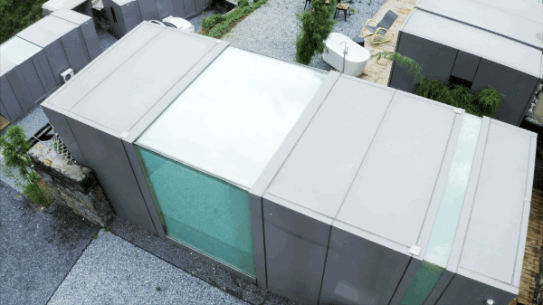 整個(gè)酒店從建造到完成,只花了近100天。比傳統(tǒng)酒店的建造時(shí)長(zhǎng),效率提高了10倍。進(jìn)山沿途都是崇山峻嶺,現(xiàn)場(chǎng)搭建也十分困難,他們最終商定,將房子在城市中進(jìn)行搭建,甚至連擺放的拖鞋、布草、香皂都布置完成,一次性運(yùn)輸下來(lái),直接拉到現(xiàn)場(chǎng)吊裝。場(chǎng)地里沒(méi)有新增一塊混凝土,甚至沒(méi)有改變土壤狀態(tài),而是把原本的宅基地盡可能地找平,再將房子擺放上去。原本環(huán)境里的植物、微生物、蕨類(lèi),仍然可以自由生長(zhǎng)。