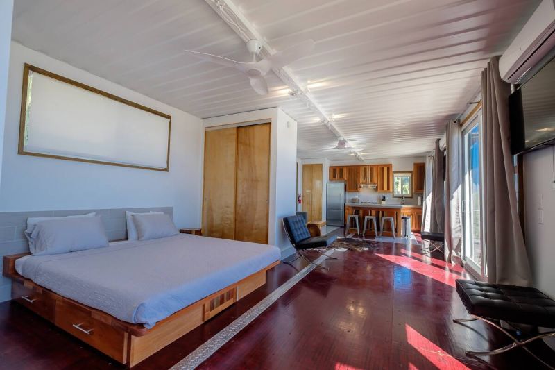 一個衣柜相隔的背面是臥室空間,一室公寓式的臥室配有一張特大號的床,可以看到房屋的地板是保留了鉚釘和其他一些原始的集裝箱材料。私人浴室位于臥室的旁邊,配有混凝土洗手臺和一個寬敞的瓷磚站立式淋浴間。