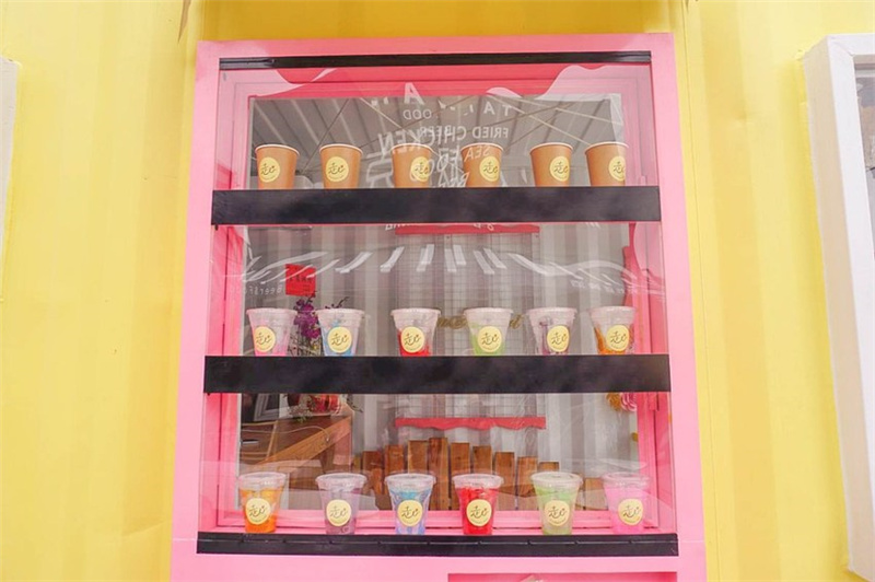 【走心cafe】是市集里面的一家咖啡店,黃色為主體色調(diào)搭配上粉紅色的咖啡售賣機(jī),鋪面而來的小清新風(fēng)格吸引著游客的眼球。