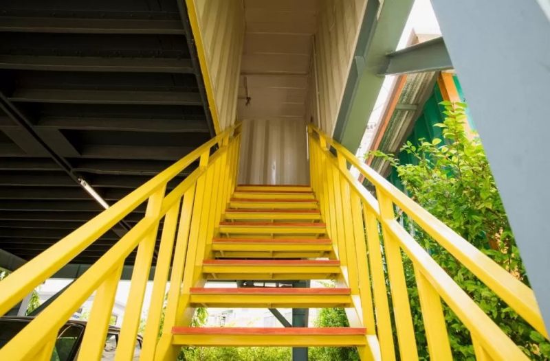 每棟集裝箱建筑的結(jié)構(gòu)都相似,由鋼架構(gòu)把兩個集裝箱模塊架在上方,下方的架空層形成了天然的停車庫,為自駕的游客提供便利。不同的建筑由不同的顏色標識,進入房間的樓梯就建設(shè)在車庫旁。