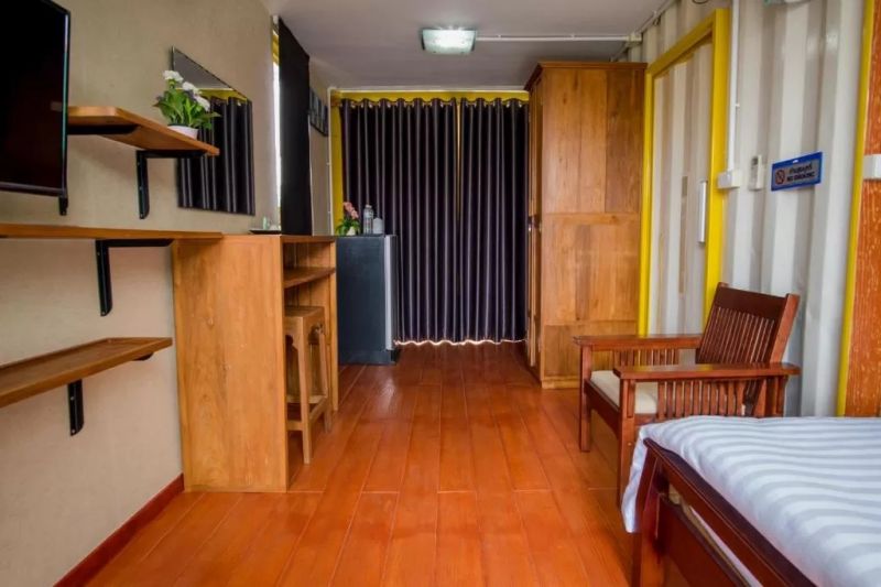 進入客房內(nèi),墻面、天花和地板都已經(jīng)過鋪設(shè)和隔熱處理,但你仍然能在房內(nèi)看到集裝箱波浪板的原始模樣,為空間增添工業(yè)的味道。