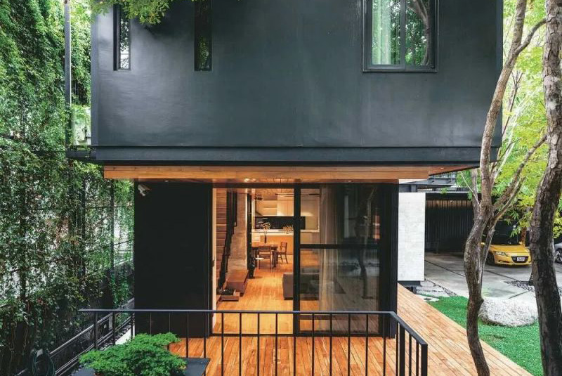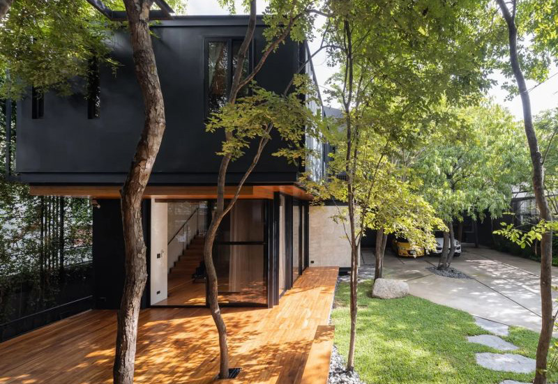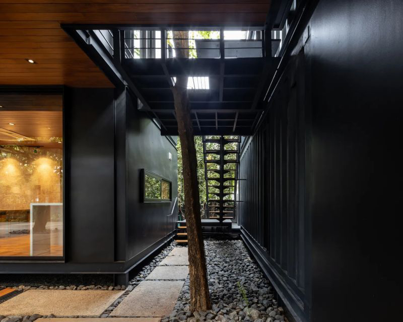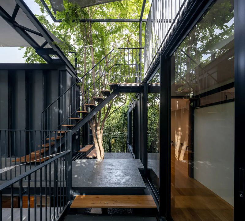 在郁郁蔥蔥的寧靜和平氣氛中,這座房子卻位于繁華的城市中心。房屋本身的特點(diǎn)是使用黑色的集裝箱模塊作為房屋和工作室。房屋的入口擁有柚木地板、混凝土板、帶有大礫石嵌件的花園人行道等,將花園與房屋的樓梯相連。花園里的車庫屋頂上有一個(gè)洞,可以讓樹木穿過二樓生長,同時(shí)起到支撐的作用。