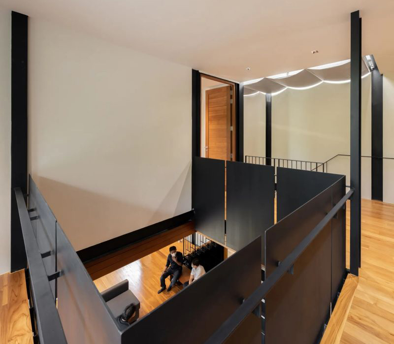 樓梯下的鋼制儲(chǔ)物架創(chuàng)造了額外的存儲(chǔ)空間,作為欄桿的鋼筋,它是木材與金屬的完美結(jié)合。二樓樓梯的頂部是一個(gè)天窗,在晴朗的日子可以露出天空,與樹木和諧相處;在不需要的時(shí)候則可以拉上窗簾,保持陰涼。
