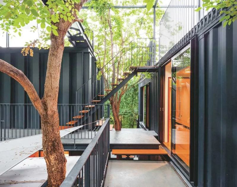 房屋的入口由一條從地面上升起的坡道形成,在柵欄的前面可以看到一個(gè)集裝箱亭子,里面有一個(gè)花園,連接著兩層樓的房子,是一個(gè)熱帶庭院中的集裝箱房子。集裝箱房屋的前部設(shè)計(jì)是高出地面的設(shè)計(jì),各個(gè)生活功能區(qū)域的劃分明確,僅由前廊相互連接。