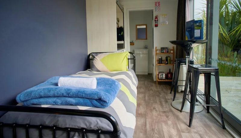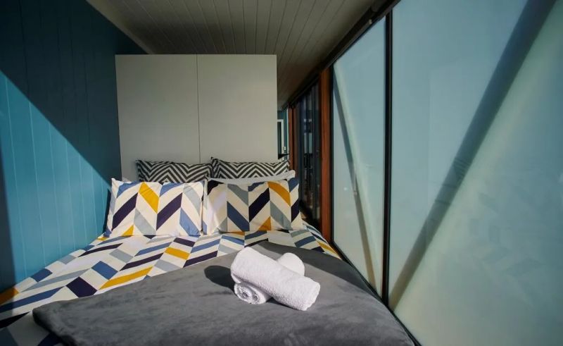 房屋的另一邊是一柜之隔的臥室,一張舒適的雙人床靠墻而設(shè),全透玻璃窗擁有磨砂窗簾,在需要私密環(huán)境的時候便可以打開使用。房屋內(nèi)的軟裝材料都挑選了令人舒適的材質(zhì)和色調(diào),布置溫馨,讓住戶可以真正享受休息。
