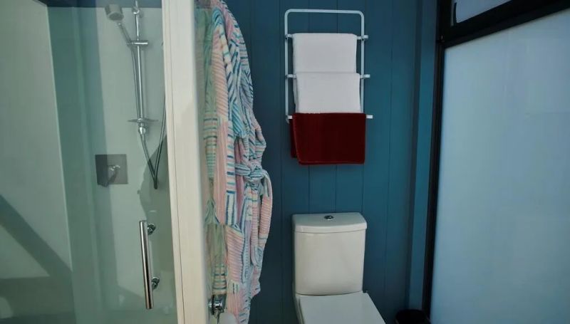衛(wèi)浴間設(shè)置在該集裝箱的一個末端位置,小巧的空間內(nèi)擁有獨(dú)立的浴室,用玻璃立板圍起。一旁磨砂的玻璃窗既能透光又能保持私密性,打造了節(jié)能的生活場所。