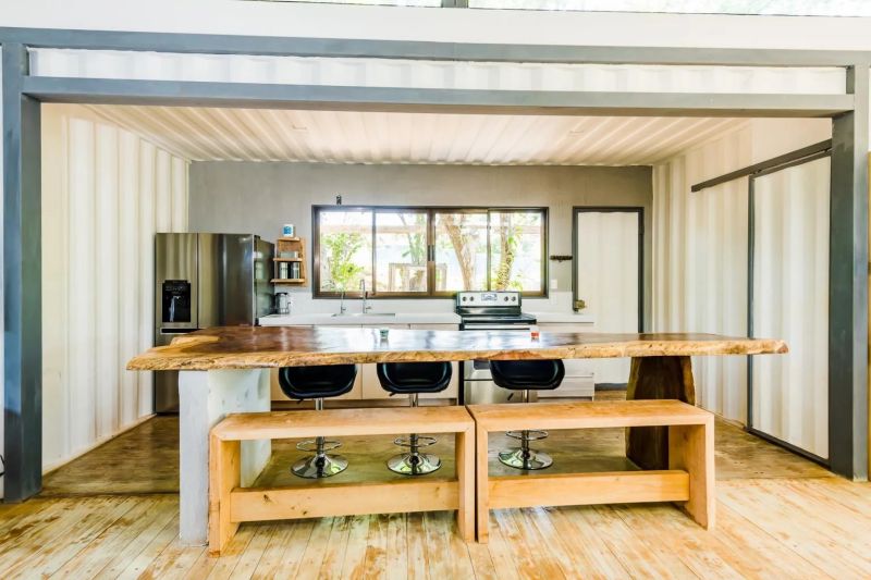 這座美麗的集裝箱房屋建設(shè)在4000平方米的土地上,房屋周圍環(huán)繞著一條60平方米(645平方英尺)的游廊,鋪設(shè)干爽的原木地板,放置簡易的餐桌椅,住戶可以在此放松身心,享受愉快的寧靜時光。