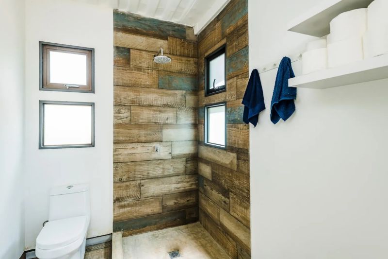 該集裝箱住宅共擁有一個客廳,三間臥室,一個大廚房,兩個浴室和一個洗衣房。每個臥室和衛(wèi)浴間都開設(shè)多扇通風透光的窗戶,為居住提供舒適明亮的環(huán)境。所有臥室都以原木地板鋪設(shè),衛(wèi)浴間則以防潮瓷磚墻面鋪設(shè)。