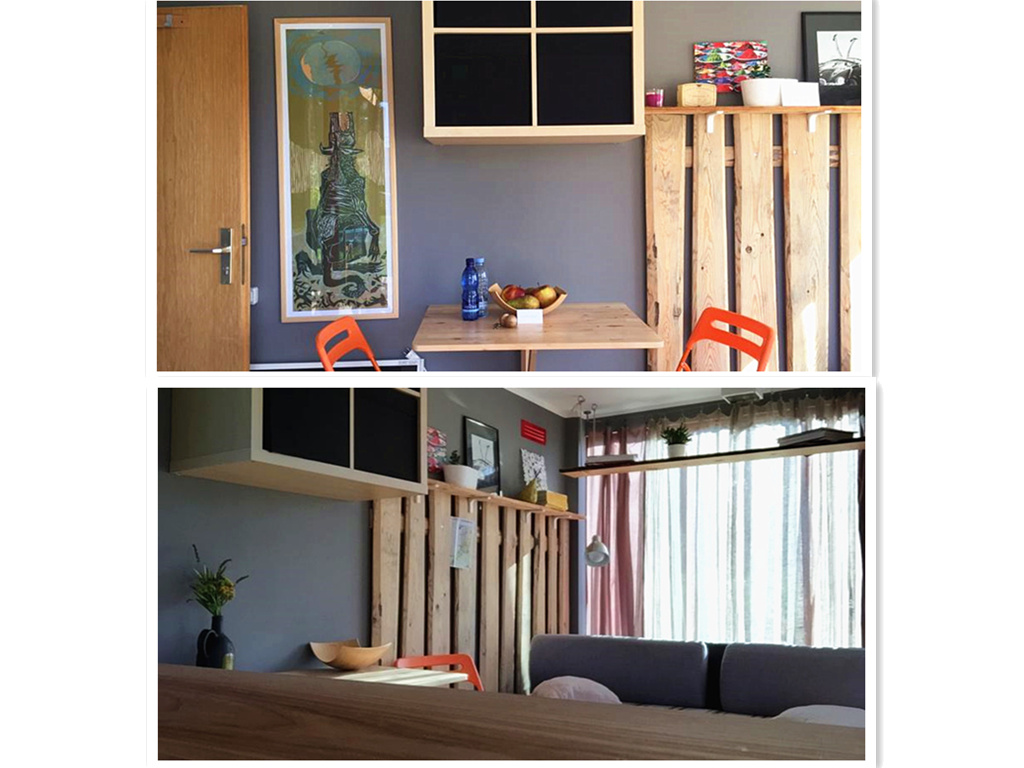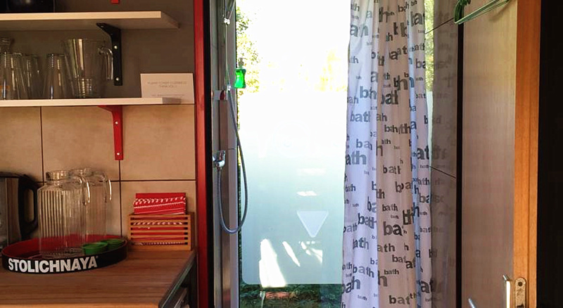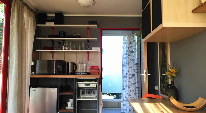 休息室位于房屋入門的右側,沙發床放置在窗邊,陽光透過窗簾照射進來,為原本狹小封閉的空間提供了良好的采光,溫暖舒適。門口左側的置物柜放置了微波爐、水壺以及各種餐具,旁邊還擺放了木制的桌椅可供使用,客人可以在此就餐。私人淋浴室位于置物柜隔墻的背后,浴室衛生間一應俱全。