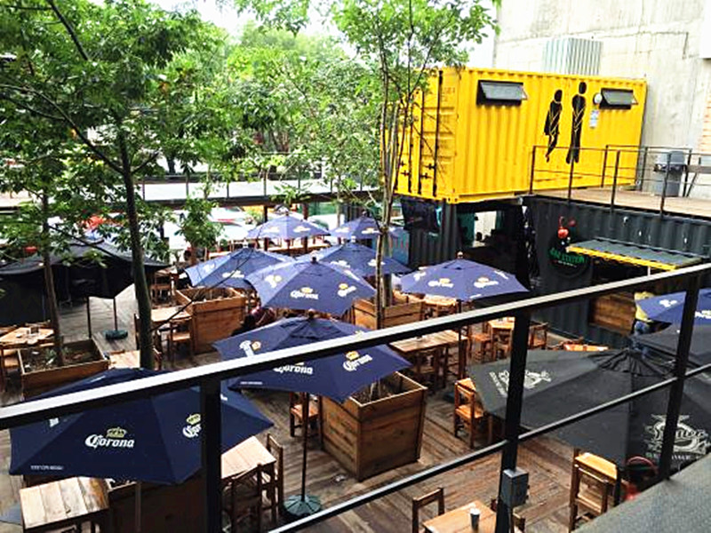集裝箱體經過改造,側板改裝成遮陽板作為餐廳入口或窗口,內部根據各店面需要加以內部裝修,箱體表面加上各類裝飾涂鴉,充滿街頭風情,親和感十足。
