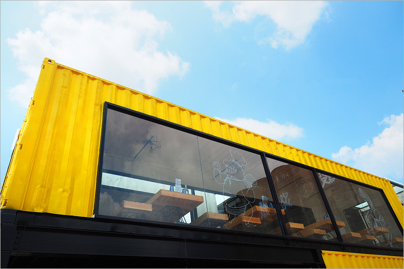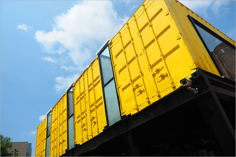 踏進(jìn)園區(qū),一座明亮耀眼的黃色集裝箱群引入眼簾。集裝箱立面分別被切割或者鑲上玻璃門窗,窗戶上貼上了各式各樣的圖案,這樣一來既保證了建筑內(nèi)部的通風(fēng)和透光性,也美化了建筑外觀。