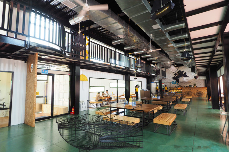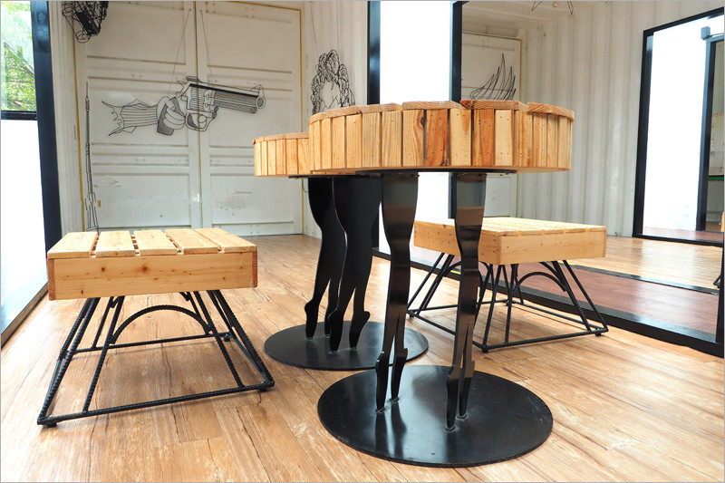 集裝箱內(nèi)采用了大量的木質(zhì)材料和家具,家具采用鐵制的各種造型和木板相結(jié)合,簡約時尚。建筑內(nèi)部是一個復(fù)合式的餐廳,兩層都可供客人使用,墻面都畫上了Q版的經(jīng)典人物圖像,游客可以和這些造型各異的圖像拍照留念。除此以外,園區(qū)還有特別的鐵絲藝術(shù)飾品,鐵絲環(huán)繞成不同的物品造型,獨(dú)特吸引。