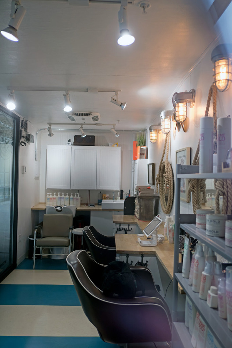 雖然每個集裝箱的實用面積甚至造型都是相似的,但是每家進駐的店都可以根據(jù)自己的特色來重新設(shè)計。比如說這家理發(fā)店,橙色的外形首先吸引路人的注意,箱身上繪畫剪刀和梳子標(biāo)明用途。