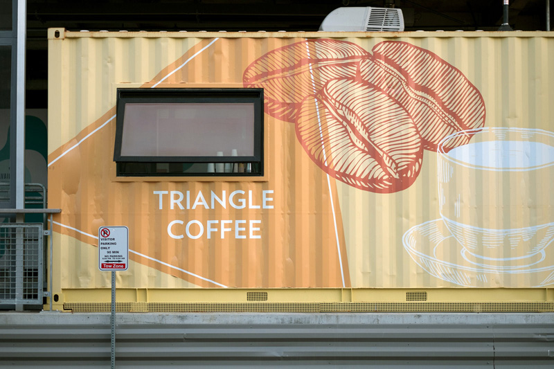 這里也有許多風(fēng)格迥異的咖啡店,與集裝箱長方體反差形狀的“三角咖啡”,大大的咖啡豆印在了箱身上。