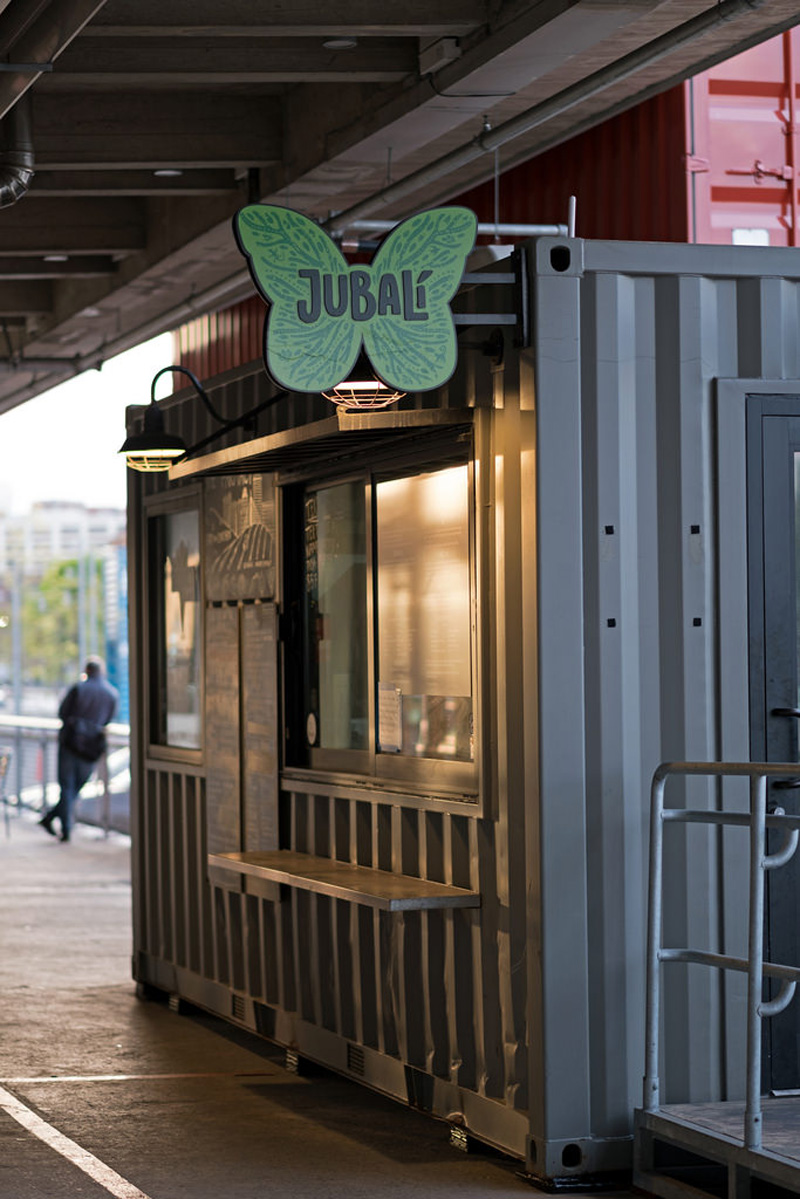 【Jubali Farmacy】也是一家餐廳,提供當(dāng)?shù)剞r(nóng)場產(chǎn)出的有機餐,冰沙和小吃。蝴蝶狀的招牌非常有新意,集裝箱旁邊還有一個斜梯,有利于貨物的運輸。