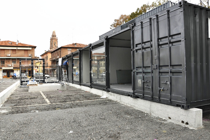 該購物中心共運用了34個40尺箱體組合而成,在提供商鋪的同時也為人們提供了一個巨大的戶外公共區域。該項目于2013年得到了當地婦女協會的贊助并重新翻新,同時也被移動到博洛尼亞市繼續用于商業用途。