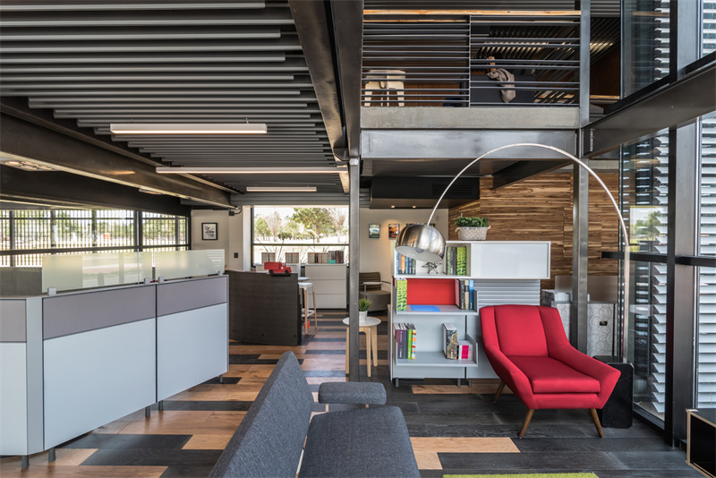該辦公空間的設(shè)計包含了一系列在城市中脫穎而出的工業(yè)建筑,包括重復(fù)使用集裝箱作為建筑物的塊體分配器,將大面積的內(nèi)外可見落地玻璃窗、金屬和結(jié)構(gòu)梁等材料混合在一起,增強(qiáng)了建筑高新科技的主要特征。