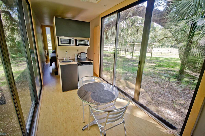 小屋一側的小廚房兼作分隔模塊,一個小桌子和幾把椅子被放在中間,就在兩組窗戶之間。