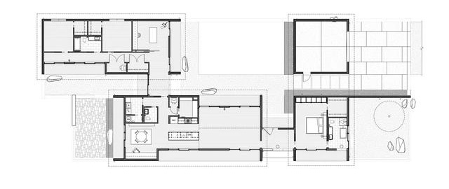 傳統日本房屋的一個顯著特征是使用了engawa,這是一種有頂覆蓋的連廊,通常用木材完成,沿著房屋的外圍延伸,作為房屋和花園之間的過渡。每個屋子在從內部空間到外部空間的過渡處都融入了單獨的engawa空間。這些有蓋門廊還通過在engawas的大型滑動玻璃門上方伸出懸挑,以幫助控制太陽熱能照射。