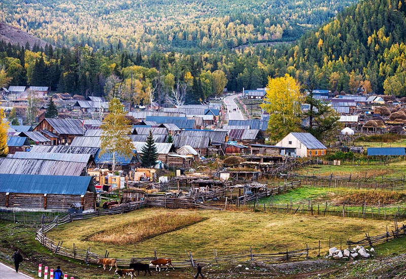 在新疆美麗的喀納斯湖旁,有一個(gè)小小的山村——禾木村,它坐落在崇山阻隔的一個(gè)大河谷里,秋天,放眼望去,都是熱烈而明朗的金黃色——小河、木屋、炊煙、樺林以及禾木橋上放牧的人們。原木壘砌的木屋散布在村落,牧馬人在叢林間揚(yáng)塵而過(guò),萬(wàn)山黃遍的醉人秋色在炊煙中宛若仙境,古樸的山村景致,像喀納斯湖一樣充滿神秘的色彩。